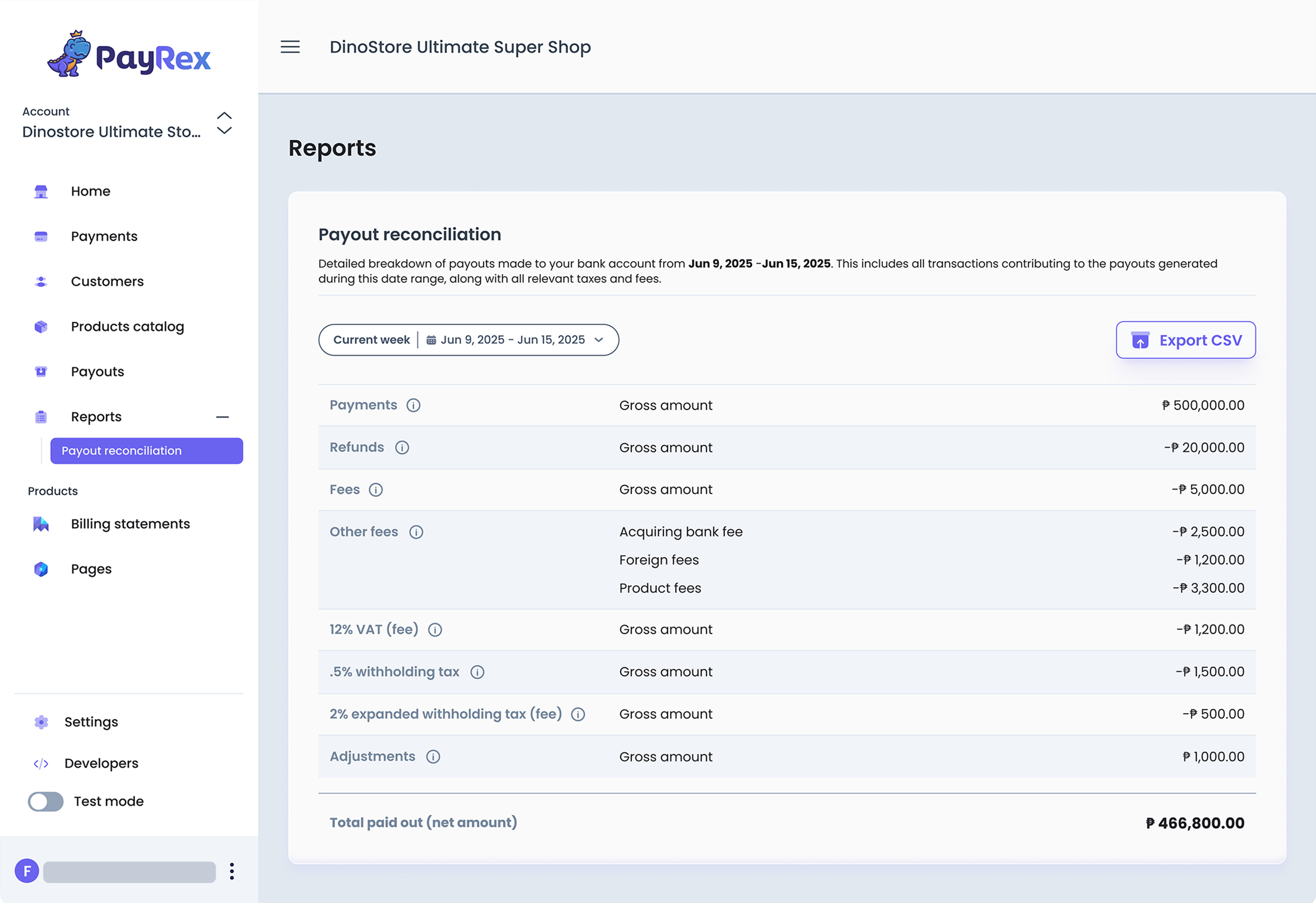 With their previous payment gateway, Wheyl received payouts once a week. Reconciling involved downloading a single report and matching it against a week's worth of transactions. With PayRex, Wheyl now receives daily payouts that cover T+2 payments, meaning they get five payouts each week (Monday to Friday). While this quicker access to funds was beneficial, it also created a financial operational challenge: every Monday, their finance team had to download and reconcile five separate payout files to close the books for the previous week.