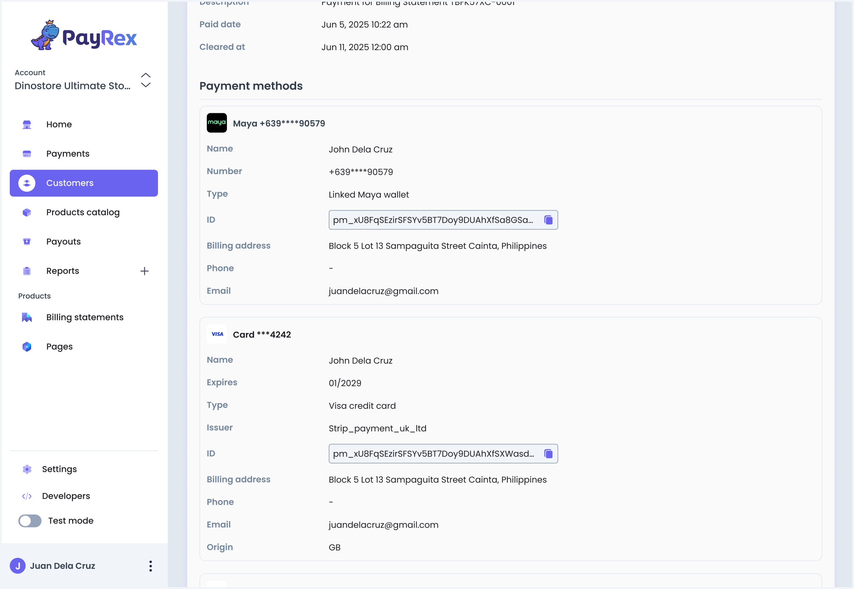 Sample display of Maya payment method on PayRex dashboard.