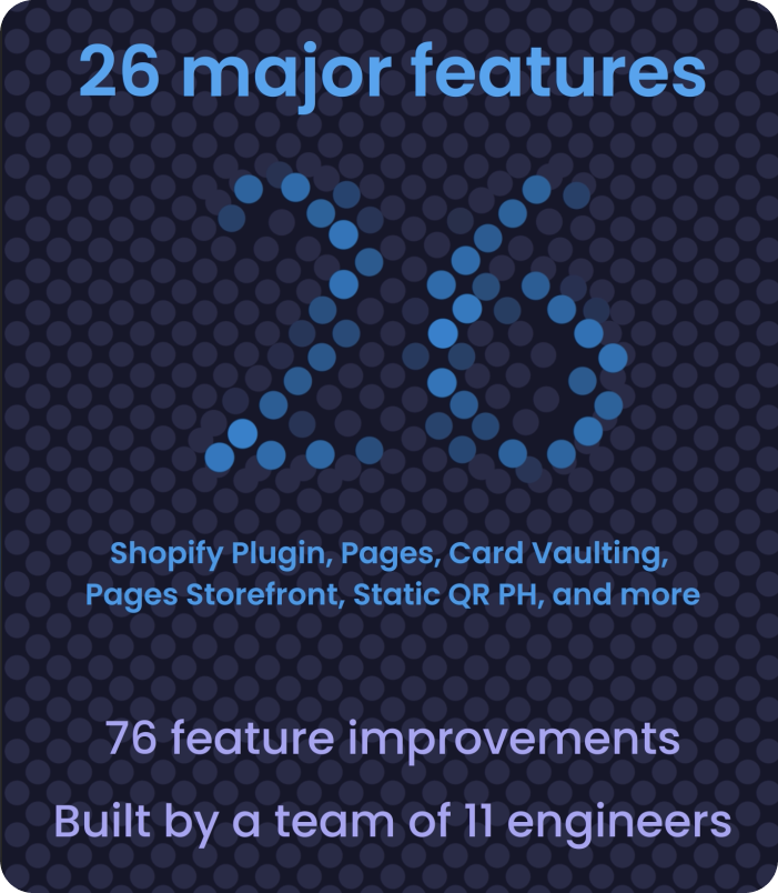With a team of 11 engineers, we delivered 26 major features this year, including our Shopify plugin, Pages, Card Vaulting, Pages Storefront, and Static QR PH. Alongside these launches, we shipped 76 feature improvements, continuously iterating to enhance reliability, performance, and developer experience.